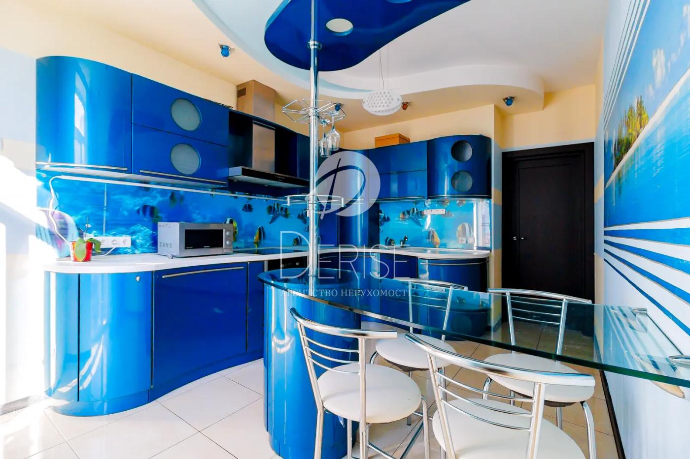 Окрема кухня з глянцевим фасадом та барною стійкою