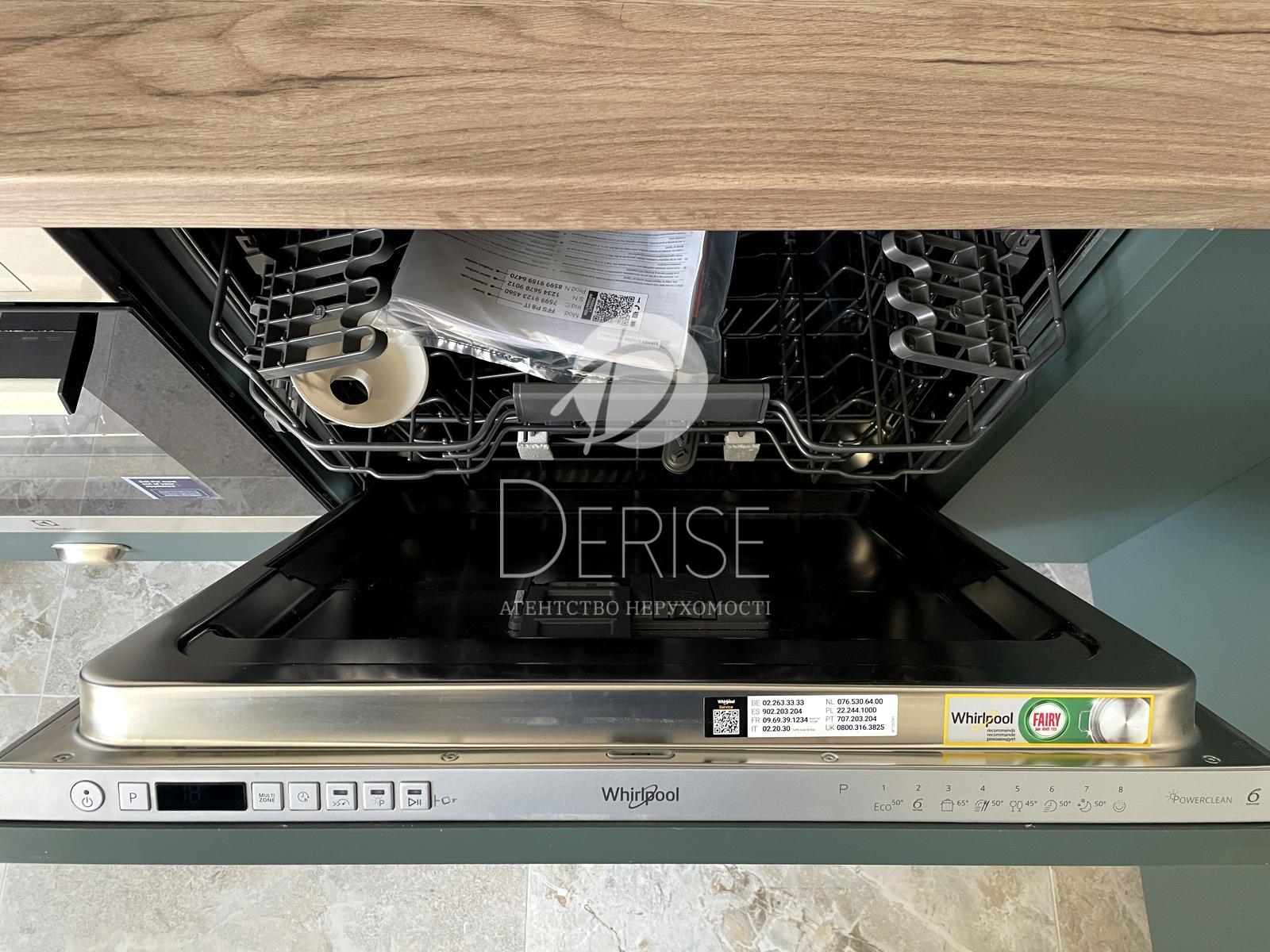 Electrolux (плита, духовка, пральна машина), Whirlpool (посудомийка 60 см, холодильник 185 см), інверторний кондиціонер Mitsushito.