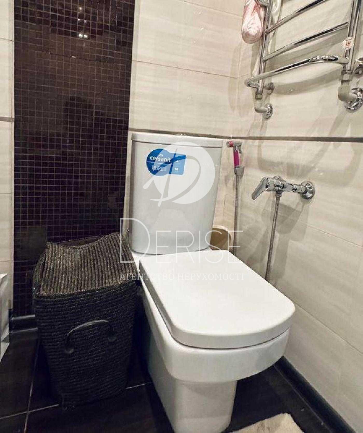 Санвузол: Сучасна плитка, якісна сантехніка, підвісна тумба з раковиною, дзеркало з підсвіткою та гігієнічний душ.