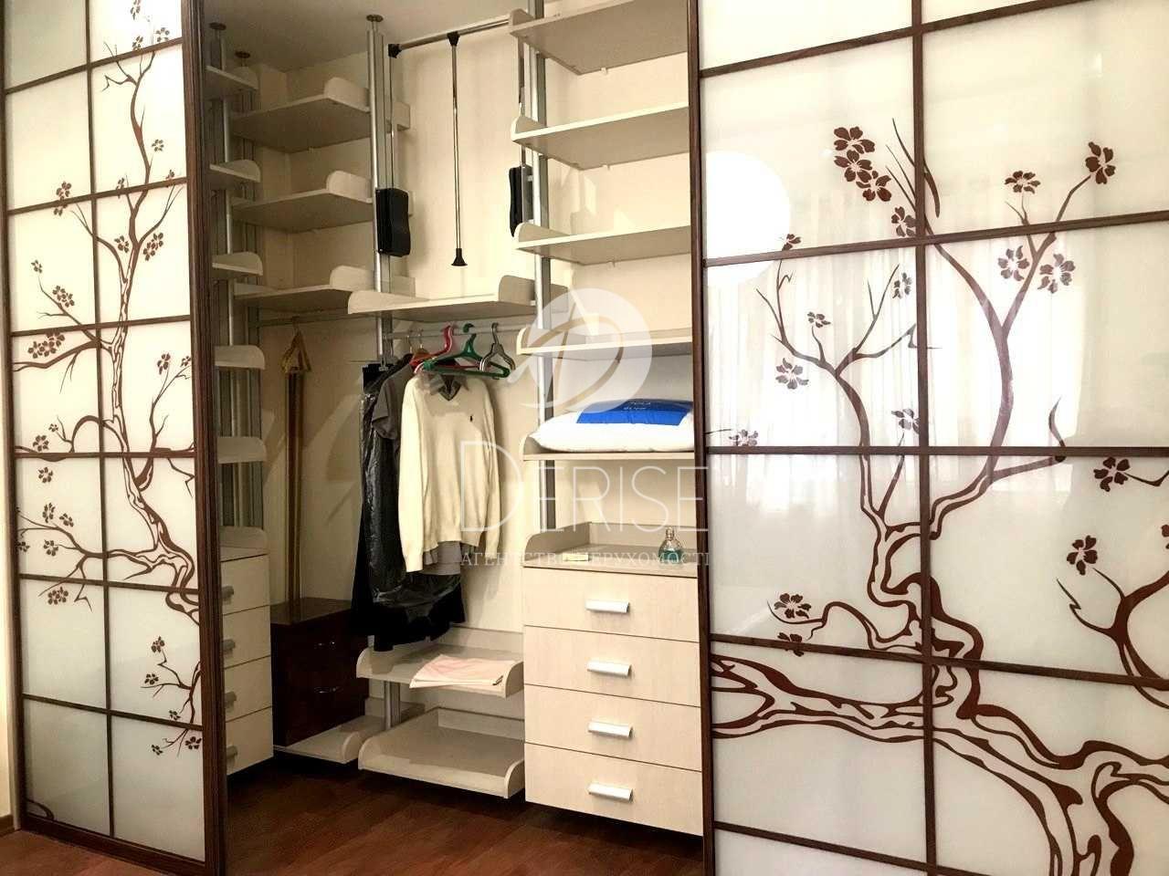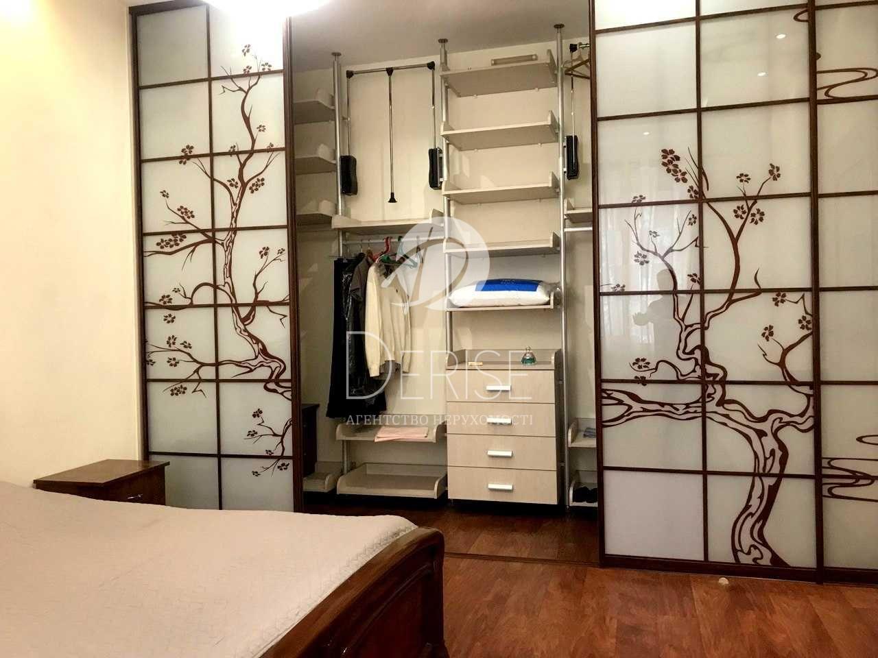 - У спальні: двоспальне ліжко, туалетний столик із дзеркалом, тумбочки, функціональна величезна гардеробна, кондиціонер,
