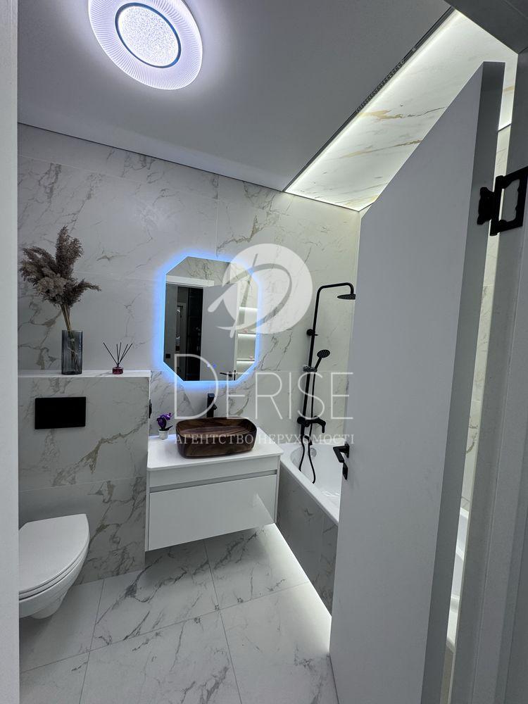 У ванній кімнаті встановлена тепла підлога. Продумано кілька сценаріїв освітлення (лайтбокси, підсвітка поличок та робочих зон).